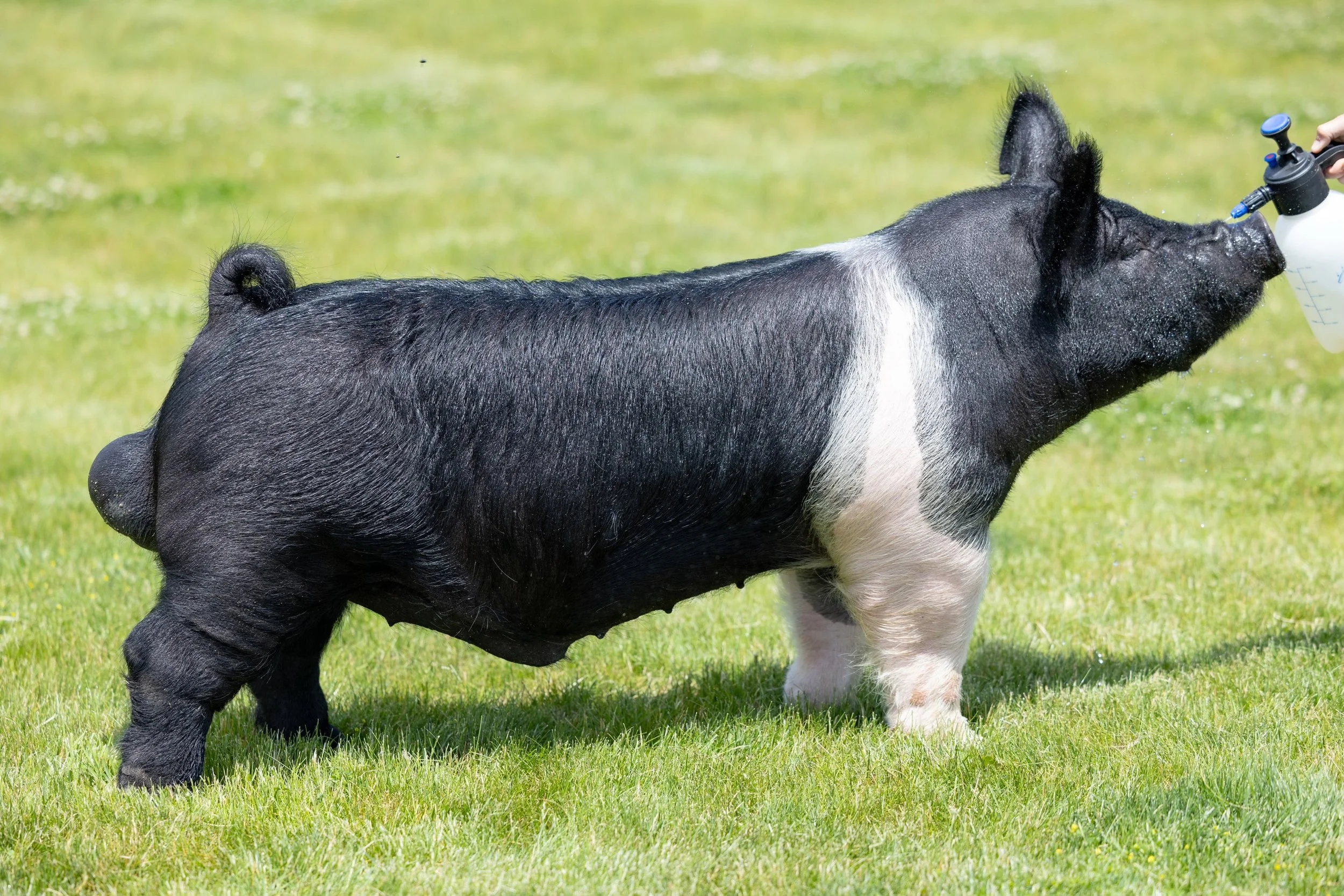 Example is one of the most anticipated Hampshire Boars that we have brought in to Goldrush in a long time. We purchased him from Platt and his sire Exclamation is on a tremendous winning streak. We have been looking for an Exclamation son and Example is a spitting image of his daddy with a monster leg. As you analyze him, Example is a beast. He is stout legged, big backed, and tremendous in his hip and hind leg. He is busted open underneath from end to end while having length of neck and a cool look from the side. Example’s mother is a littermate to the Reserve Champion Hampshire Boar at the 2022 Summer Type Conference that Heimer showed. A power packed pedigree back by an elite boar!